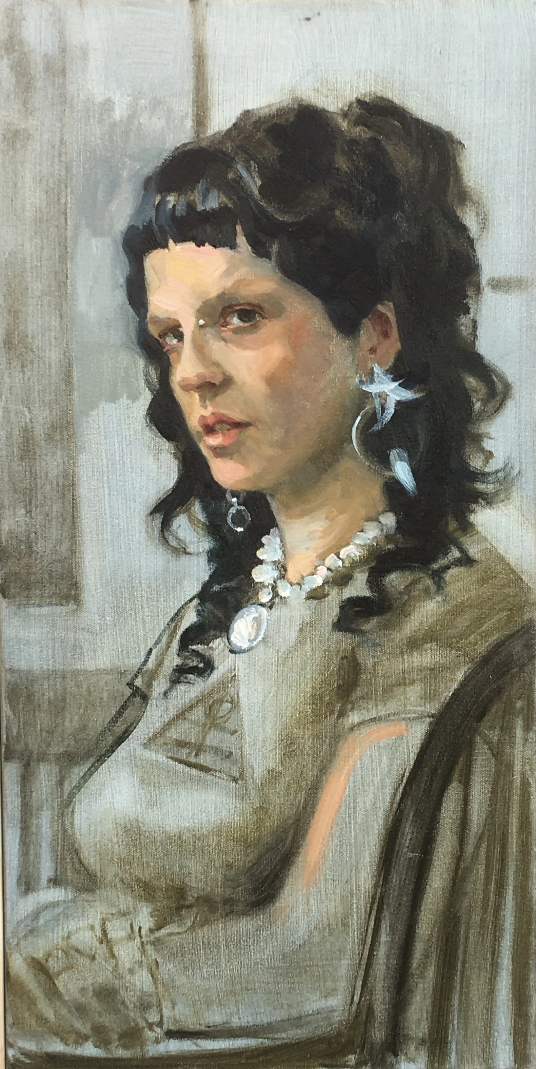 I work directly in oil on canvas or panel. My process begins with careful observation and conversation with the sitter, and after exploring the subject through loose studies, I settle on a pose. The portrait develops over several sittings, using photographic reference when necessary.